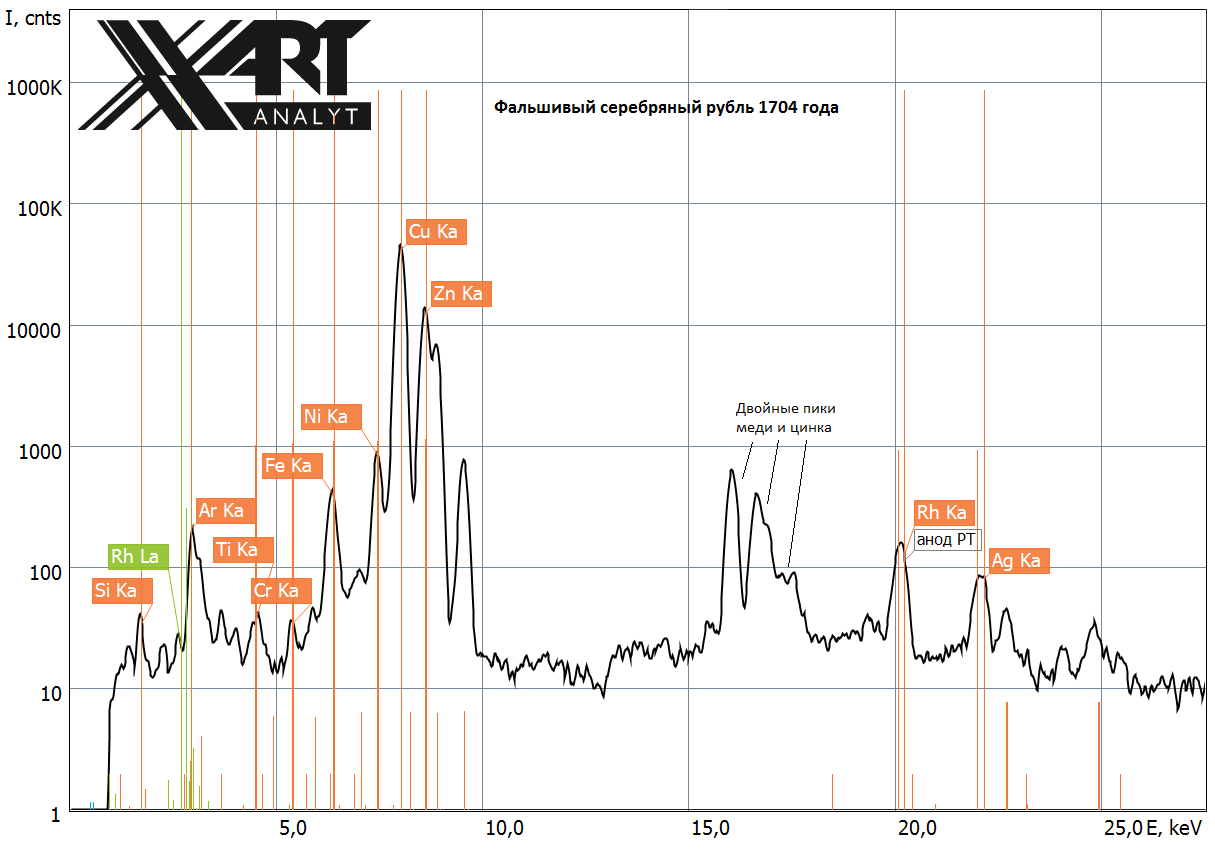 На втором рисунке приведен спектр современной фальшивой серебряной монеты в 1 рубль (Россия, 1704 год). Виден основной медно-цинко-никелевый состав монеты и только тонкий слой серебра на поверхности. При этом интенсивность пика серебра в этих условия измерения составляет 0,002 от интенсивности пика меди, в то время как для настоящего серебра 500-900 пробы это отношение равно 0,3-3.