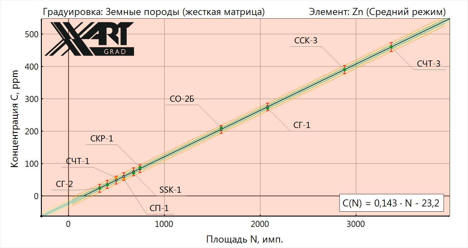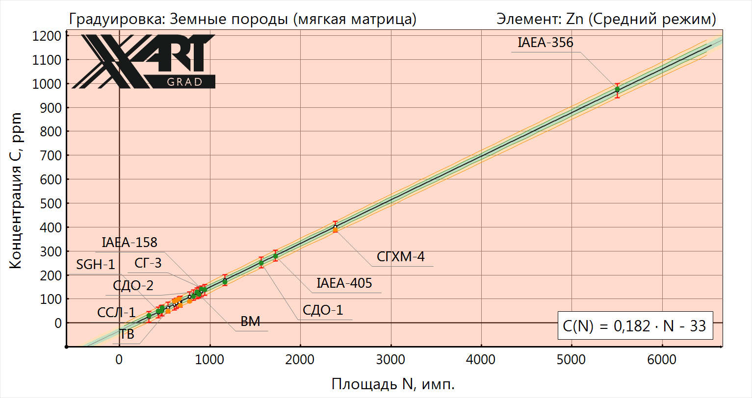 Приведены две градуировки по цинку для ГСО пород с разными матрицами,